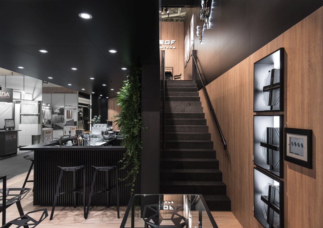 Przy zastosowaniu ciemnych kolorów elewacji umiejętność gry światłem jest nie lada wyzwaniem, ale również kompetencją projektową. Oprócz funkcji typowo wizerunkowej, należy pamiętać o zaplanowaniu przestrzeni do rozmów biznesowych. Stworzyliśmy dodatkową instalację przykuwającą wzrok – zawiesiliśmy 180 małych okienek, które nawiązywały do produktów marki Anwis, które poruszały się delikatnie tworząc wyjątkowo dla tego stoiska aranżację.