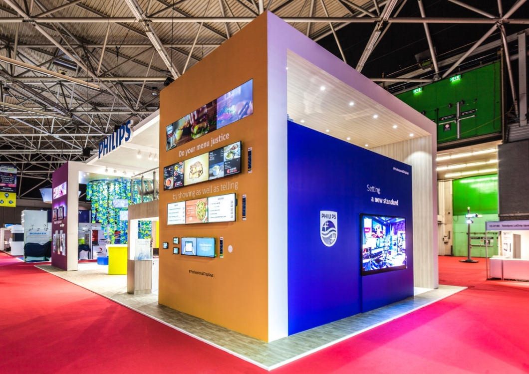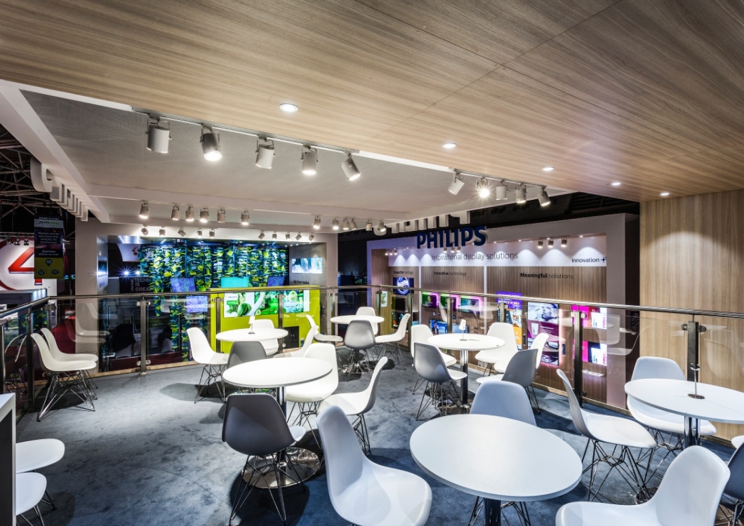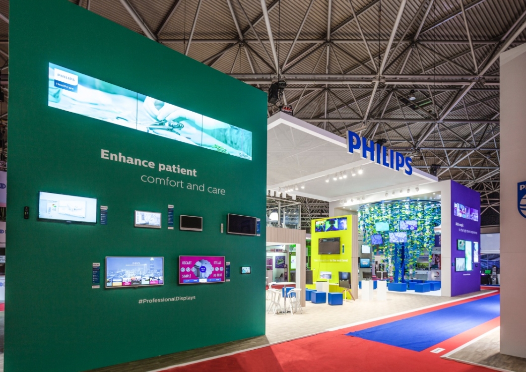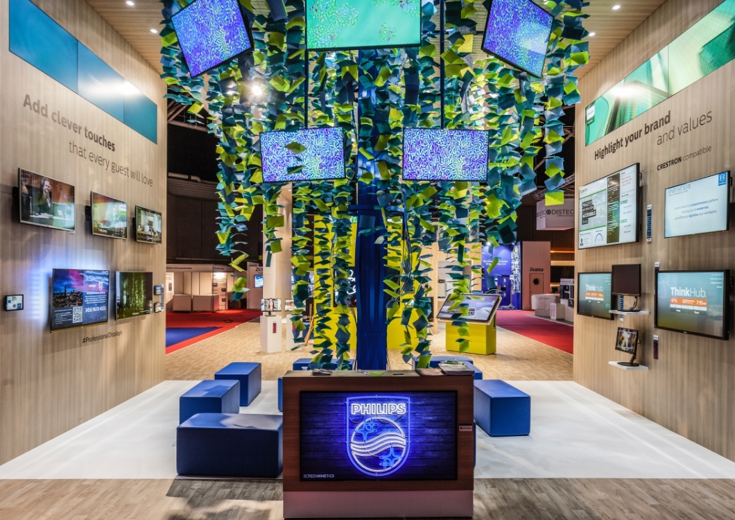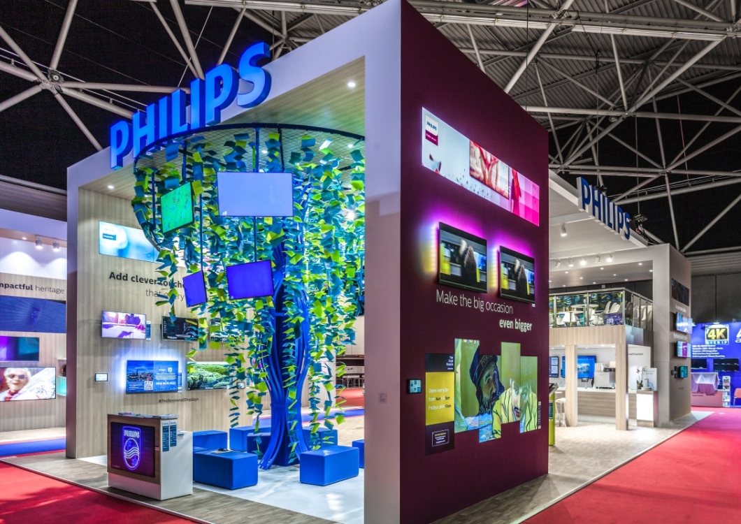 To był jeden z najbardziej wyczerpujących montaży ze względu na zimowe warunki pogode – chłód na targoywch halach bardzo utrudniał pracę ponieważ farby schły bardzo powoli. Ale jak to mówią, co nas nie zabije to nas wzmocni. Stoisko Philips miało wysokie na  6m ściany i zamontowanych ponad 100 (!) ekranów LED. Na stoisku została również zorganizowana przestrzeń na nietypową konstrukcję drzewa zrobionego z girland i ekranów ledowych. To była naprawdę imponująca konstrukcja.