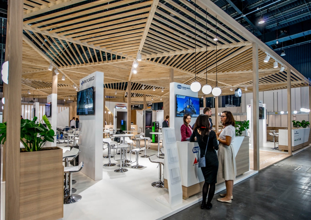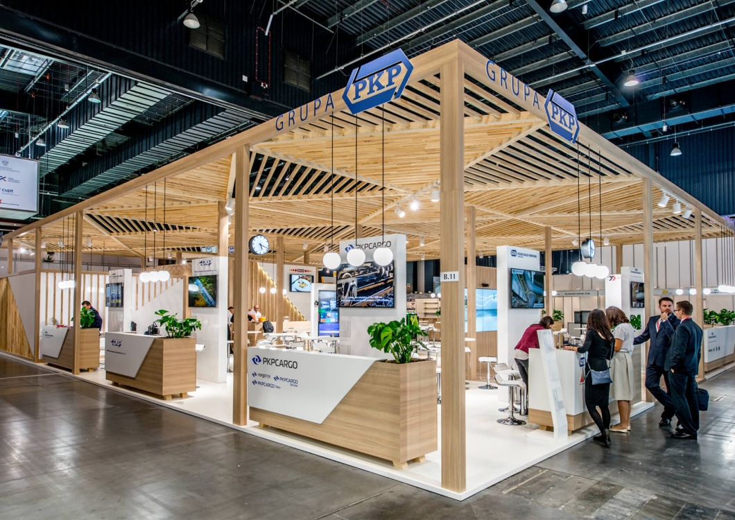 Przestrzeń wystawiennicza zaprojektowana dala grupy PKP na czas trwania targów Trako nawiązuje swoją formą do przystani – stacji kolejowej. Kluczowym i dominującym elementem stało się zadaszenie ponad 350m2 powierzchni. Projekt dachu stoiska składał się z setek drobnych, drewianych listewek, które wypełniąją wnętrza trójkątów. Najtrudniejszym zadaniem okazało się utrzymanie ważącej kilka ton „drewnianej pajęczyny” na jak najmniejszej ilości podpór, aby nie utrudniać nimi komunikacji na stoisku.