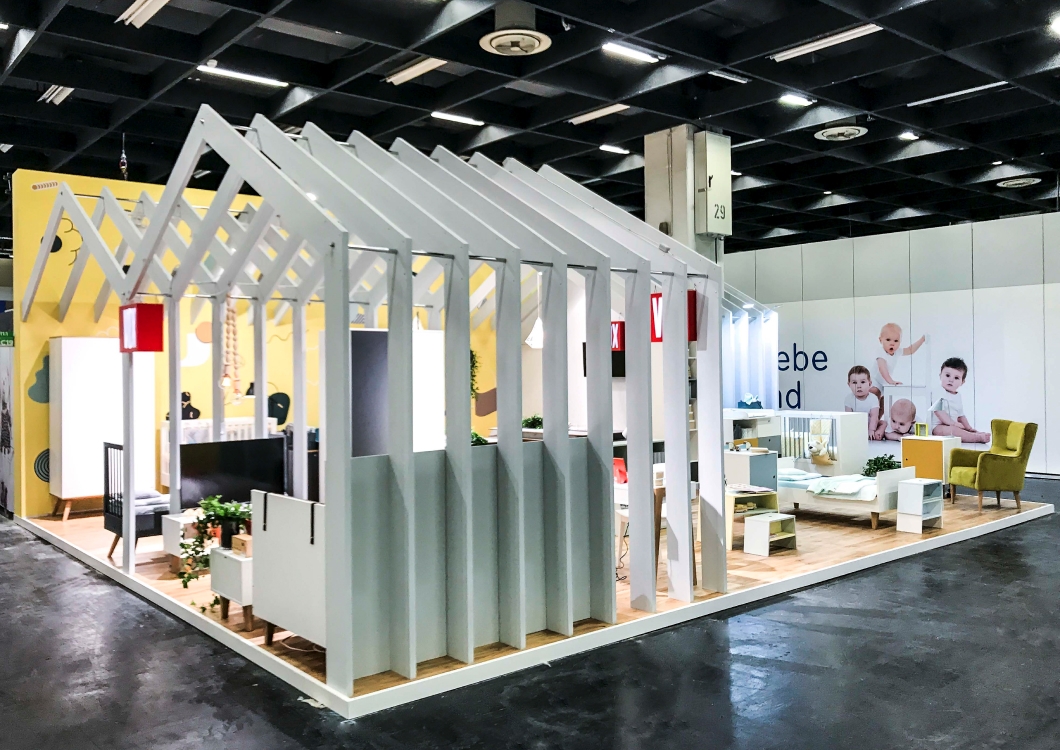 Użyliśmy malowanych belek z płyty MDF, aby zachować minimalistyczny wygląd stoiska To pozwoliło na odpowiednie zaaranżowanie stoiska przy użyciu produktów klienta.