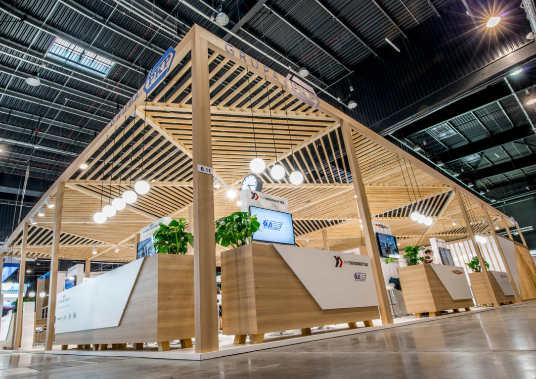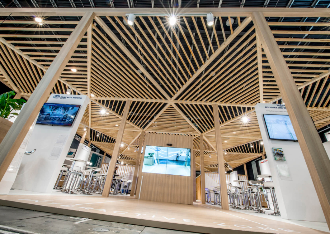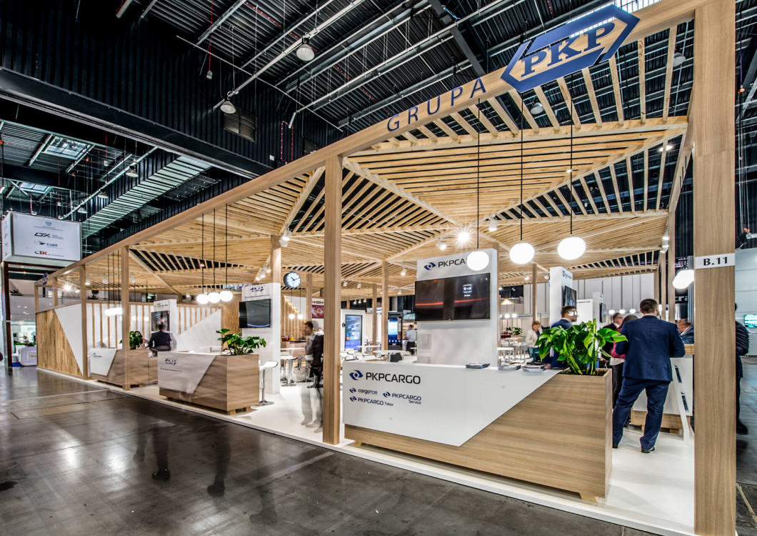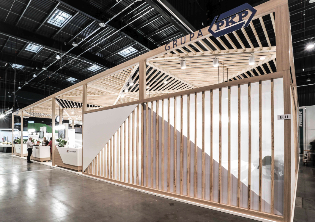 The exhibition stand designed for the PKP GROUP refers to the railway station. The starting point for this project was an openwork structure that covered over 350sqm of the stand creating a warm cozy Scandinavian-like atmosphere. The PKP logo was composed of triangles. The same shape was later used to create the elements of the roof which looked like the one of a modern railway station. The project revolves around the following features: openwork, transparency, lighting and wood.