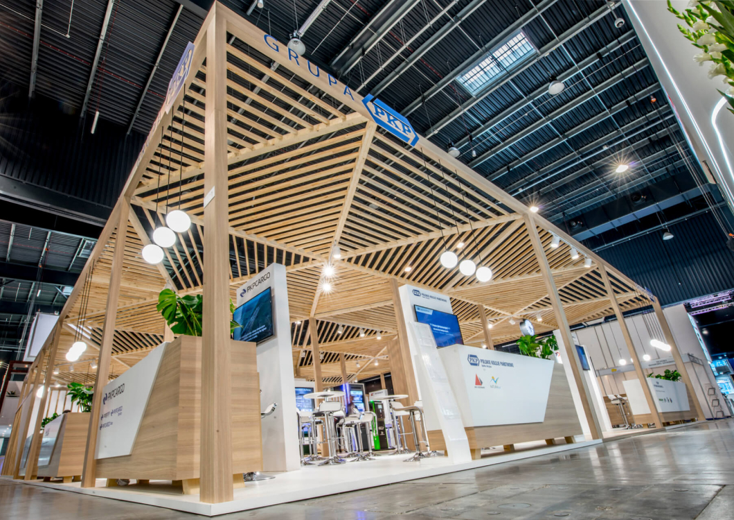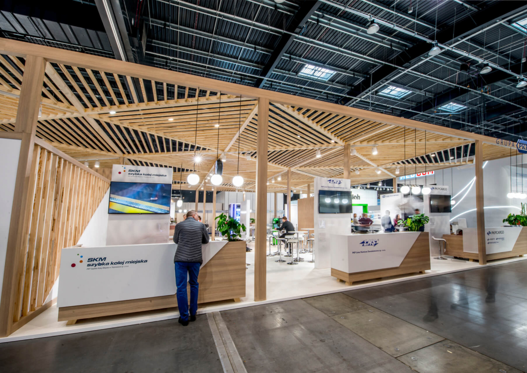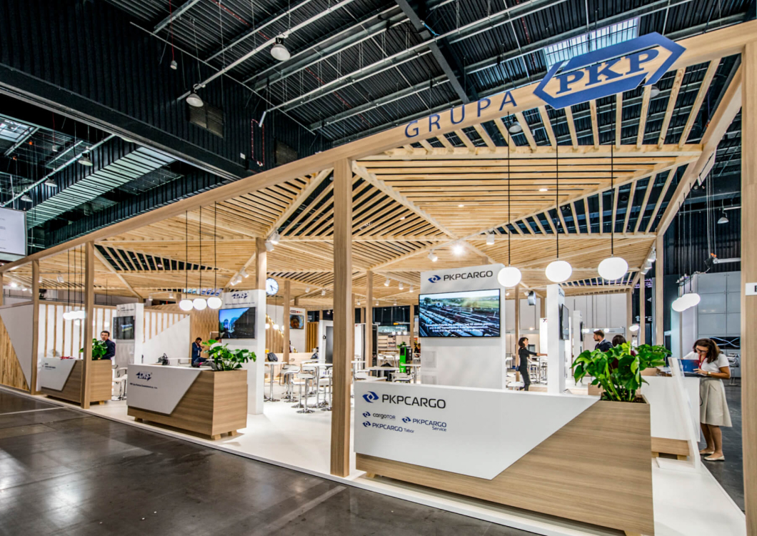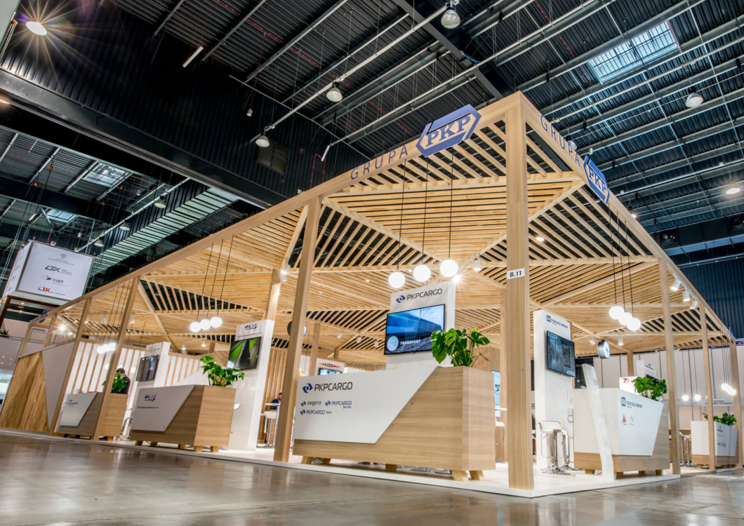 The exhibition stand designed for the PKP GROUP refers to the railway station. The starting point for this project was an openwork structure that covered over 350sqm of the stand creating a warm cozy Scandinavian-like atmosphere. The PKP logo was composed of triangles. The same shape was later used to create the elements of the roof which looked like the one of a modern railway station. The project revolves around the following features: openwork, transparency, lighting and wood.