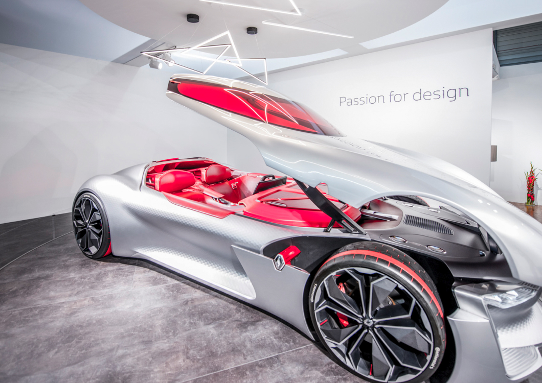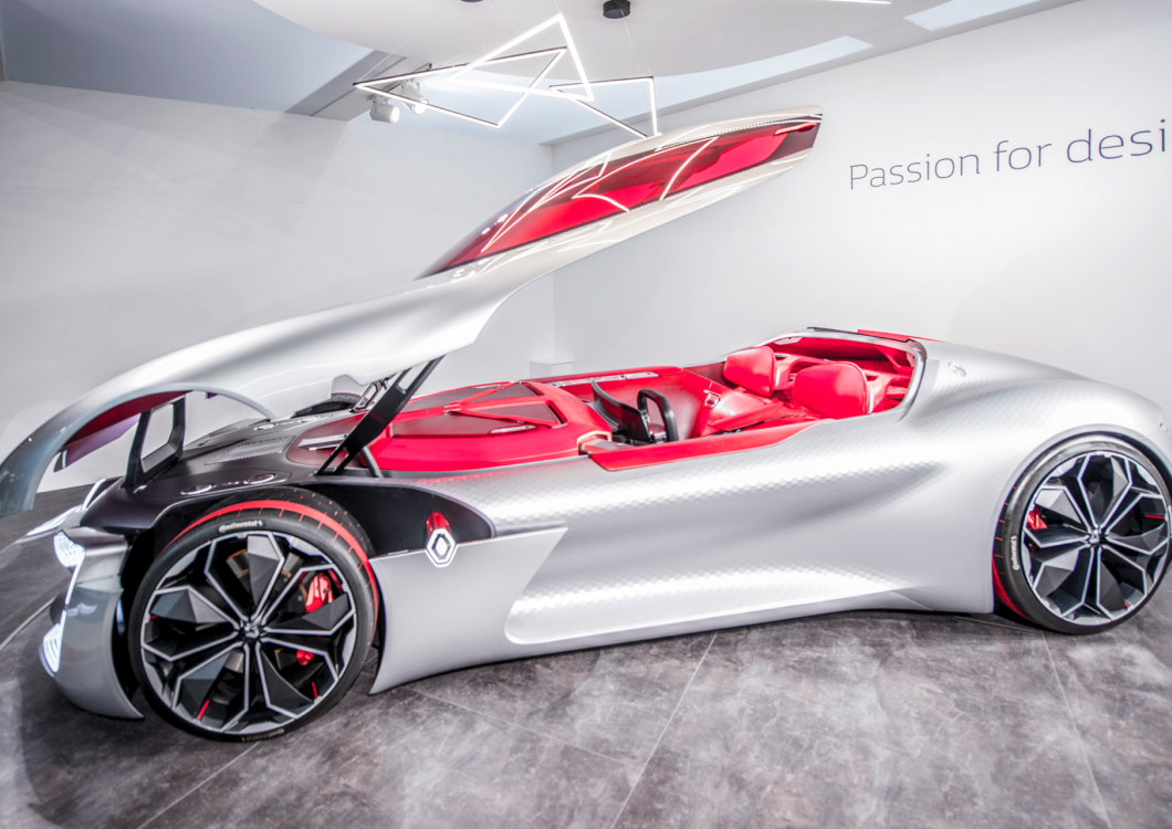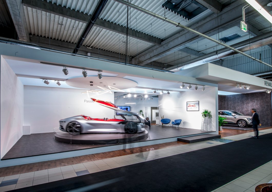 At the stand of 279m2 there were two cars produced by Renault. They were placed in two separate rooms. One of them was displayed on a concrete revolving dais (5m in diameter!) which was partly glazed. These solutions were to emphasize the innovative design of the car and to make the visitors feel the spirit of modernity. The way the other car placed in the other room was exhibited was to highlight the functionality of this car.
