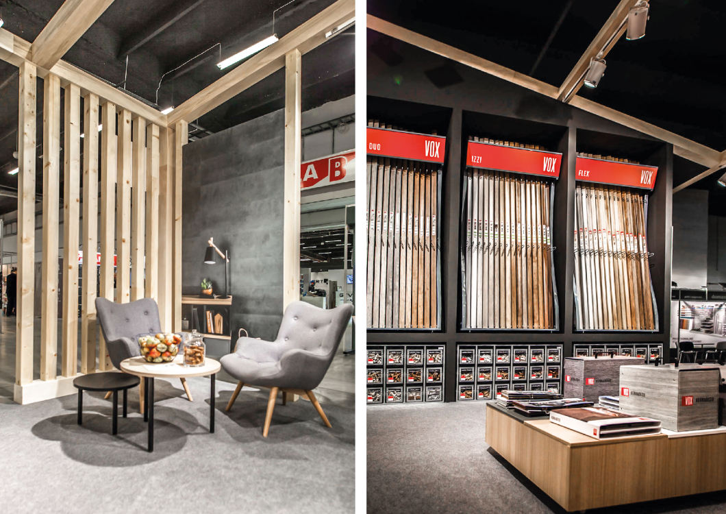 We divided the stand into two zones: the dining area with tables and a space where you could sit comfortably and drink your coffee, have a conversation or just relax, and the second zone with VOX products. We backlit each item and played with the light. This in turn drew the attention to the products located in this area so when you looked at them you could imagine having them at home.