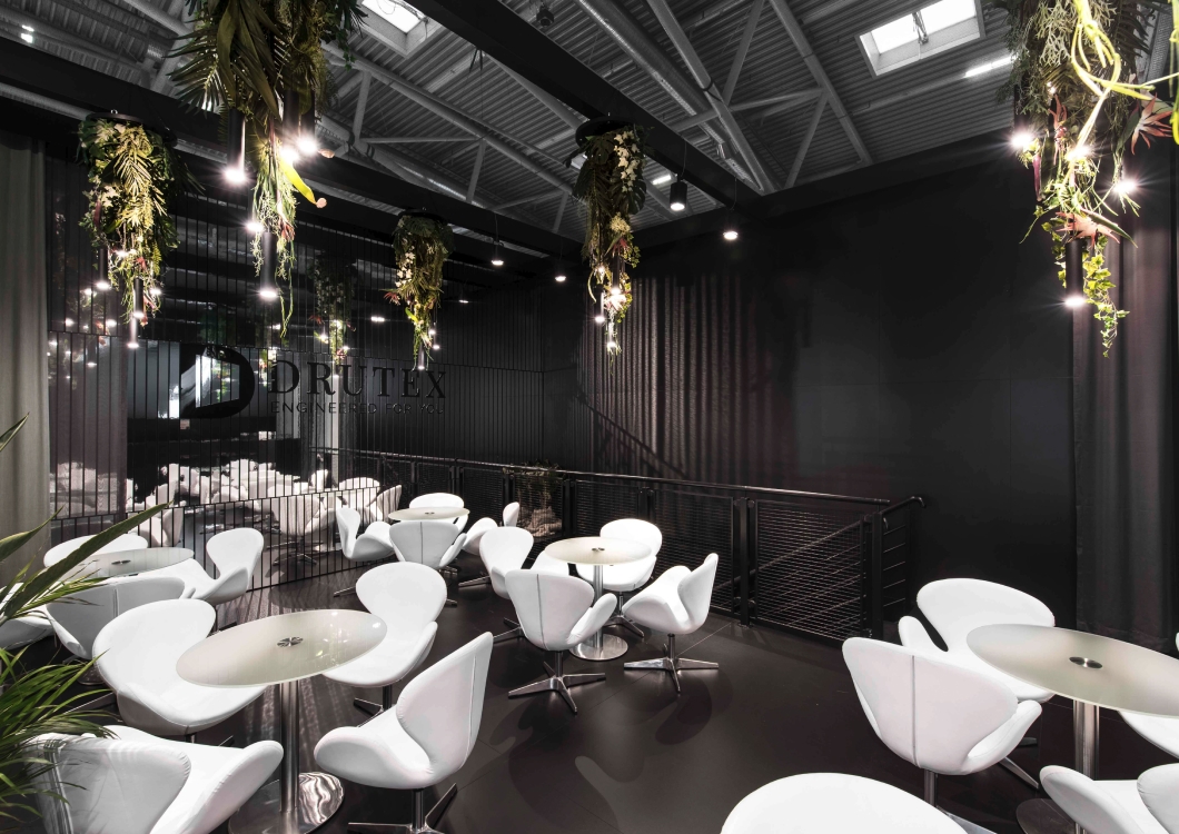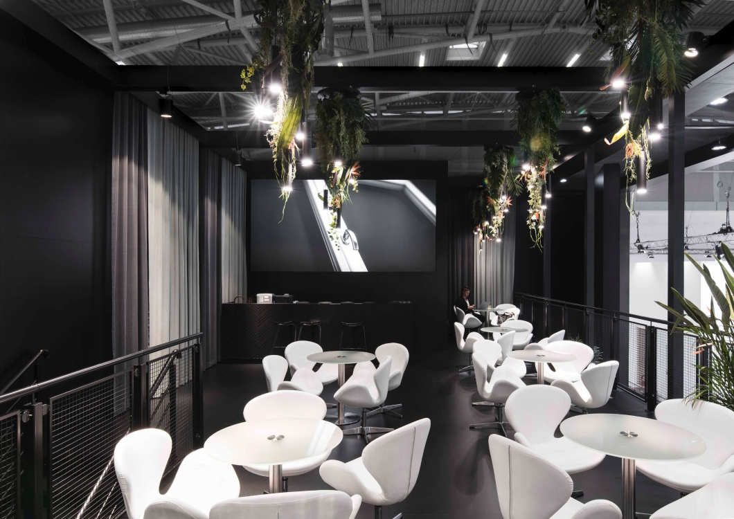 Zieleń i roślinność ma za zadanie ocieplić stoisko, nadać mu wyrafinowania i lekkośći zapraszając tym samym zapachem świeżych kwiatów do wejścia na stoisko. Użyliśmy instalacji świetlnej z kwiatami na piętrze stoiska, aby nadać mu charakterystyczny ton i umilić rozmowy biznesowe na piętrze. W połączeniu z lustrzaną ścianą było to zdecydowanie miejsce przyjazne i przytulne zwiedzającym.