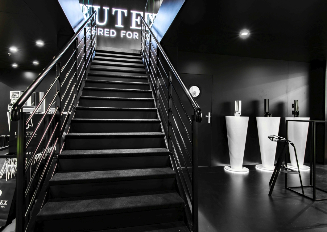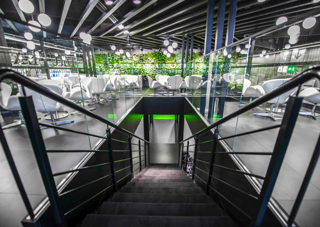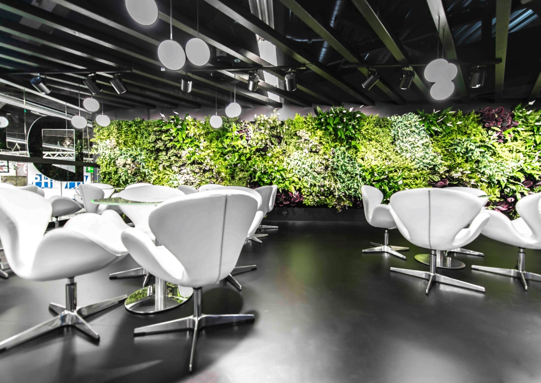 Dlatego projekt podzielony został na 2 części – produktową, umiejscowioną na parterze i część konferencyjną na piętrze. W kotraście do stalowych schodów i surowej zabudowy staje olbrzymia licząca 650 szt. roślin ściana zielona, w której dominują wiosenne, wielokolorowe kwiaty. Liczne przeszklenia, ciekawa zabudowa dachu w formie jodełki i aksamitna czerń budują atmosferę luksusu i ekskluzywności.