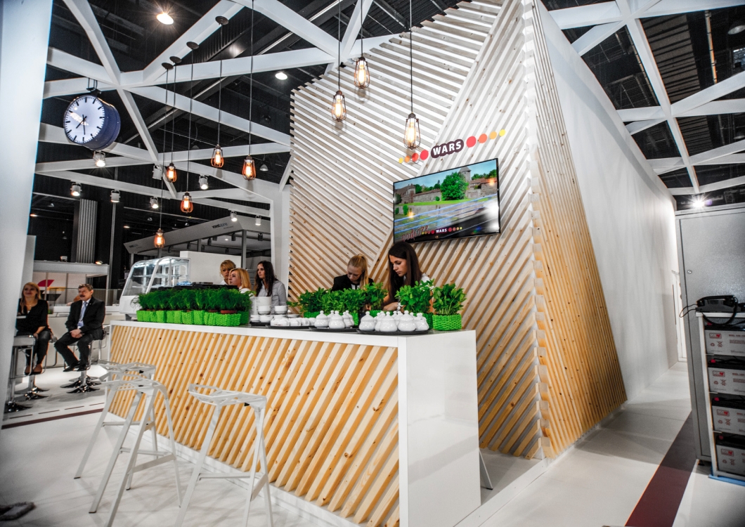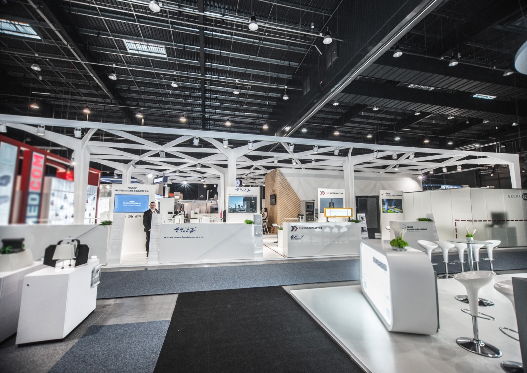 336 m² stoisko podkreśliło jedność 8 współwystawców i przyjęło formę nowoczesnego dworca – naturalnego środowiska Grupy PKP. Trójkąty, które są częścią nowej identyfikacji wizualnej stały się elementem dachu. Były widoczne również w detalu: w ladzie informacyjnej każdej z firm grupy PKP oraz drewnianej dekoracji na ścianie. Biały kolor był przewodnim kolorem w projekcie.