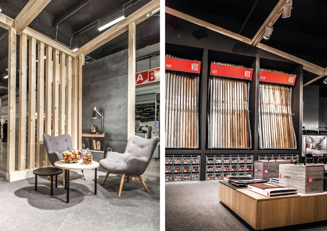 Podzieliliśmy stoisko na dwie strefy: część jadalna ze stołami i przestrzenią do wypicia komfortowo kawy, przeprowadzenia rozmowy czy po prostu zrelaksowania się. Druga strefa to strefa produktowa marki VOX. Wyszczególnilismy produkty i pobawiliśmy się światłem. Ten zabieg spowodował, że cała uwaga mogła zostać skupiona w 100% na produktach, wiec można było oczami wyobraźni zobaczyć je w wystroju własnego domu.